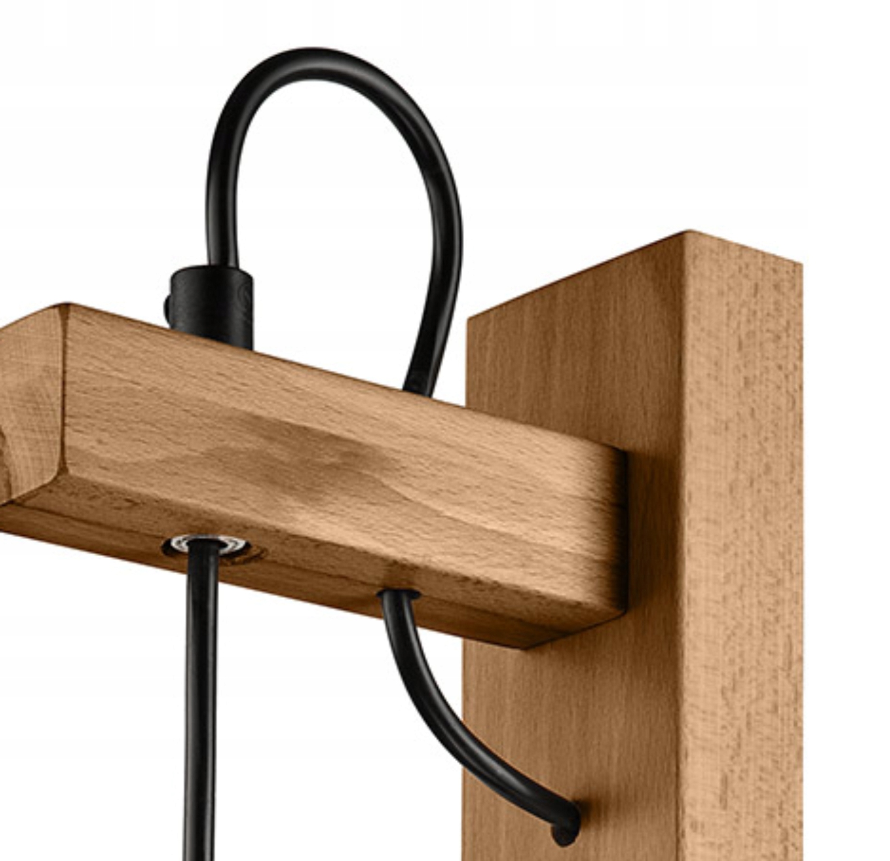 Oprawka z podstawą kinkietu połączona jest przewodem w kolorze czarnym, który jest przeplatany przez otwory w konstrukcji drewnianej.