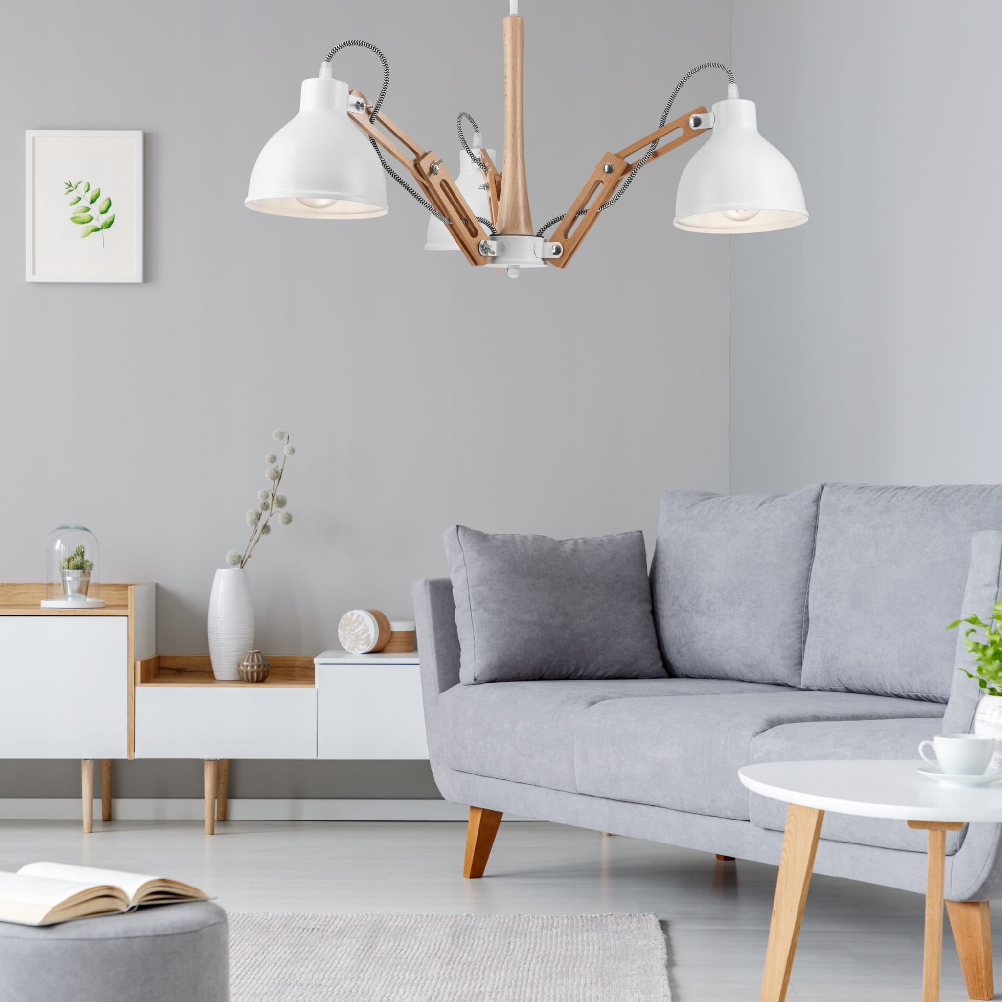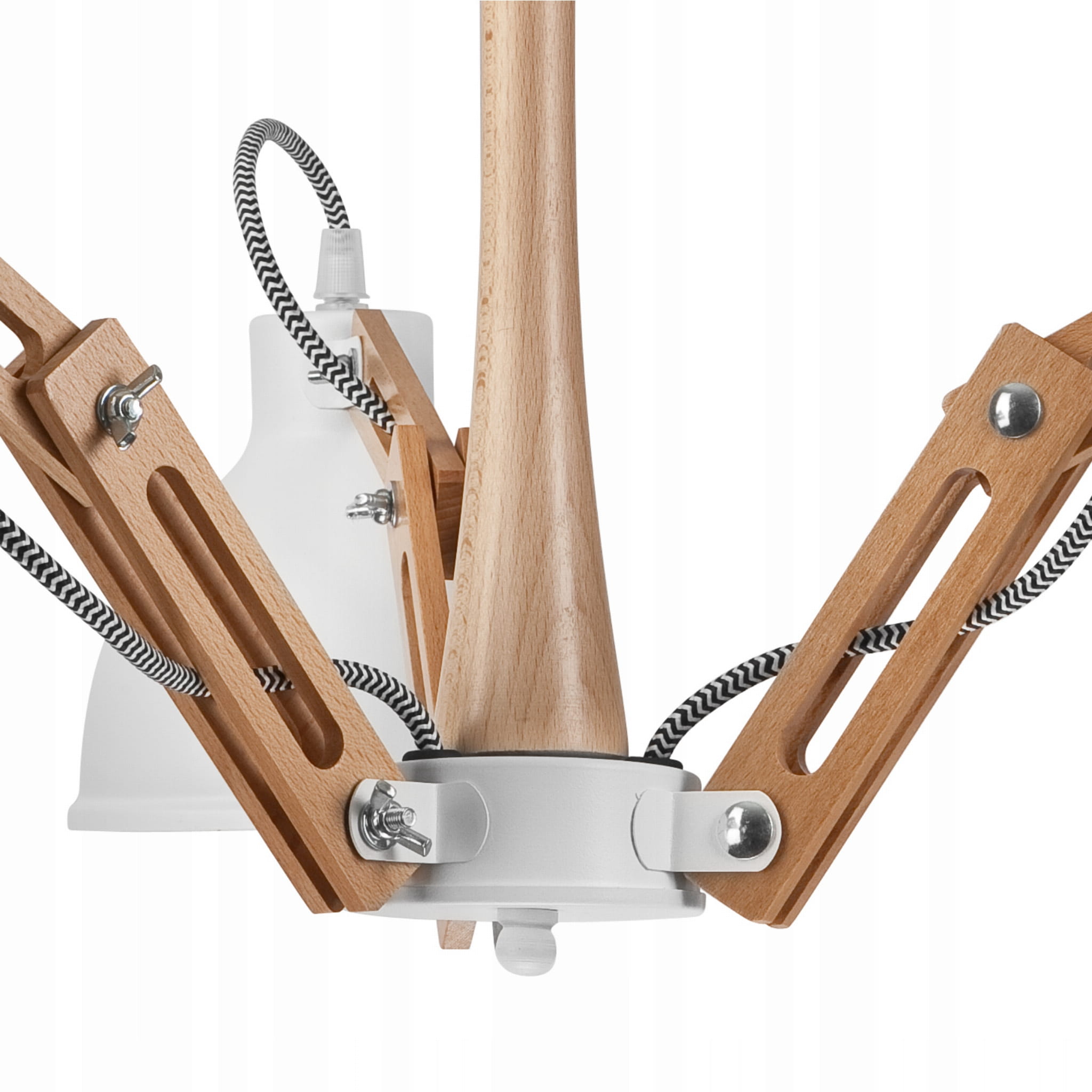 Jednym z głównych komponentów lampy jest drewno bukowe - malowane lakierem bezbarwnym. Wykonano z niego ruchome ażurowe ruchome ramiona w formie wysięgników oraz główną bazę lampy.