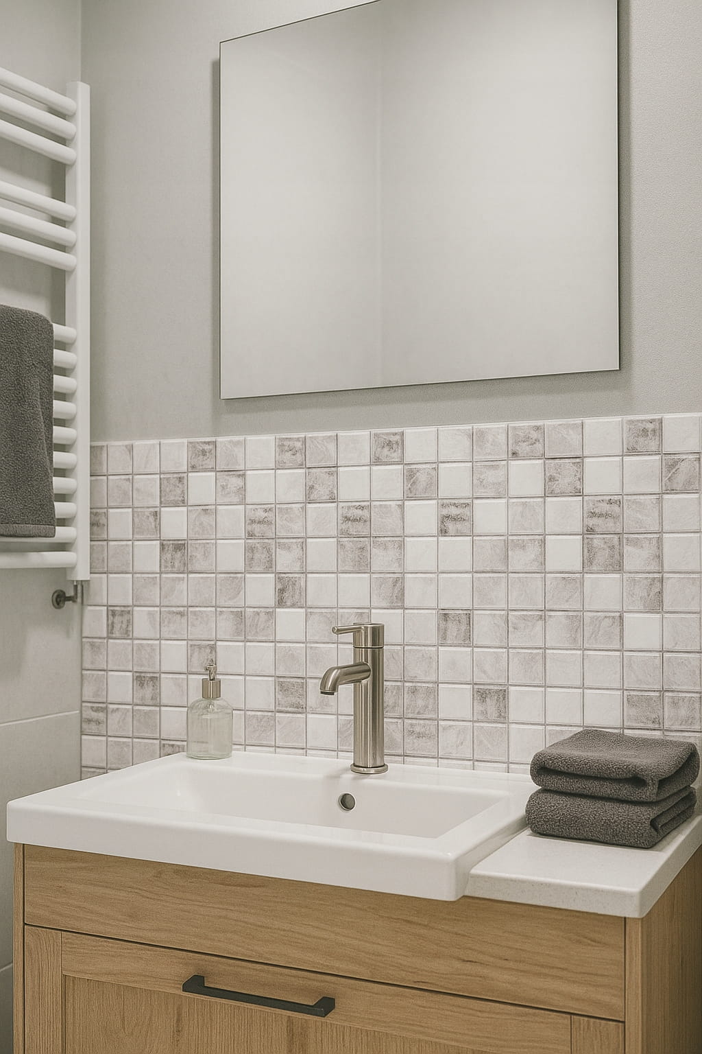 Mozaikę montuje się za pomocą kleju do PCV / paneli / płytek. Nie wymaga fugowania ani specjalistycznych narzędzi. To doskonała opcja, jeśli chcesz uzyskać trwały i estetyczny efekt bez wymiany całych płytek.