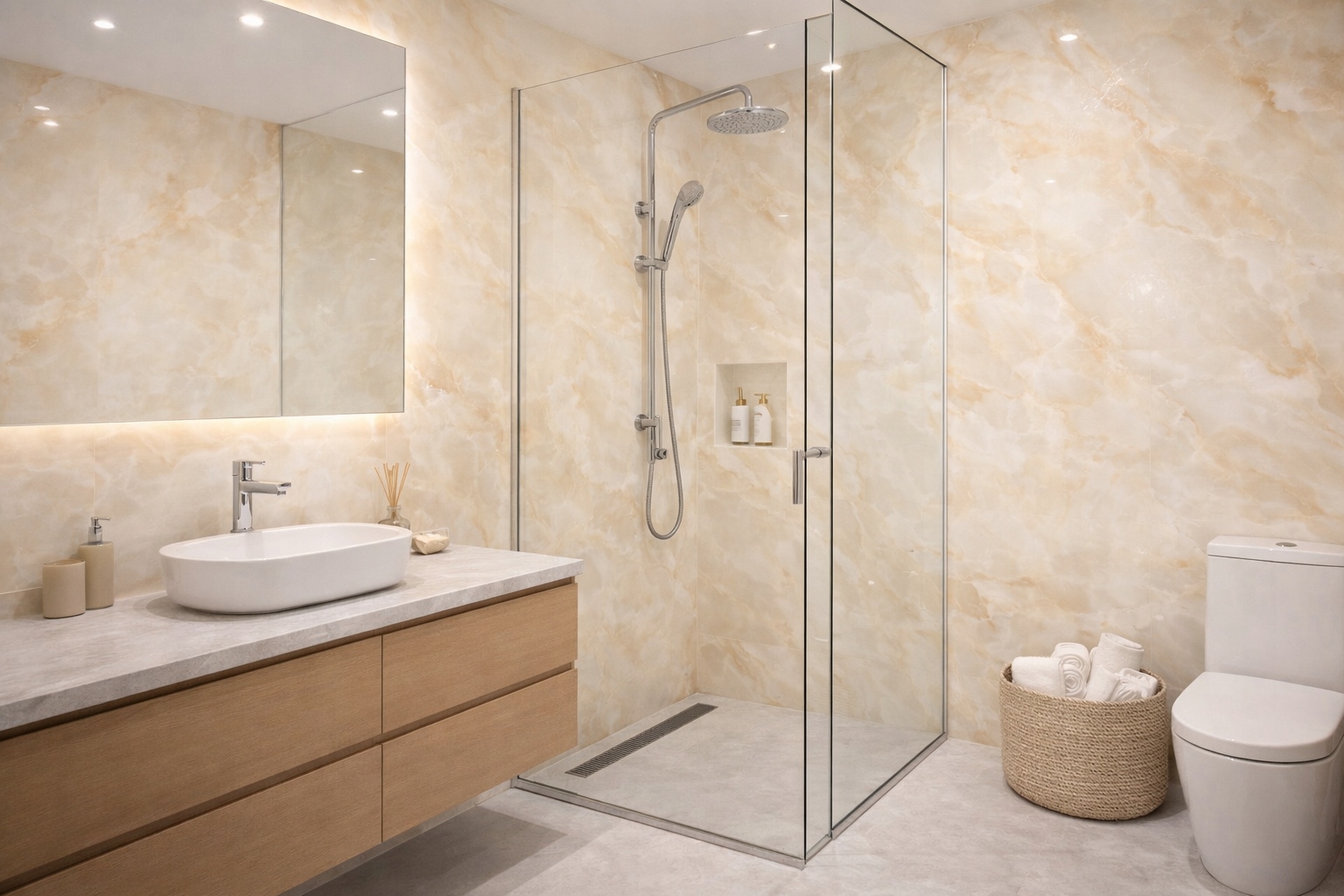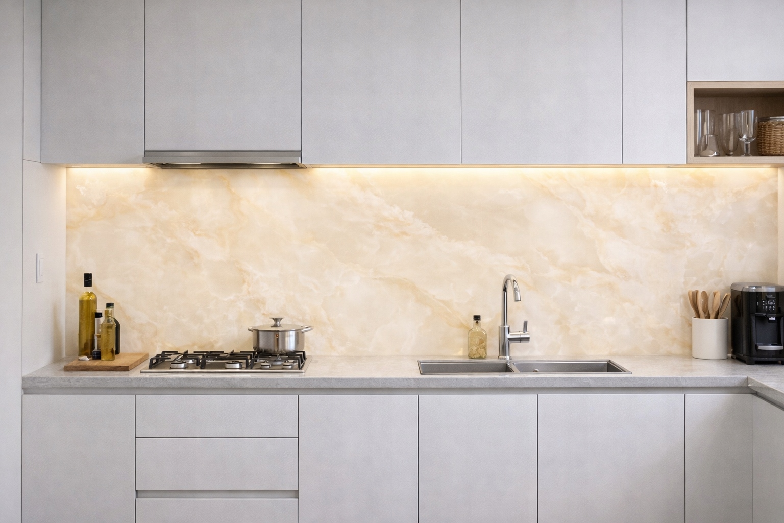 • Kuchnia: chroń ścianę nad blatem — imitacja betonu lub kafli doda stylu, a panele zabezpieczą przed zabrudzeniami i wilgocią.