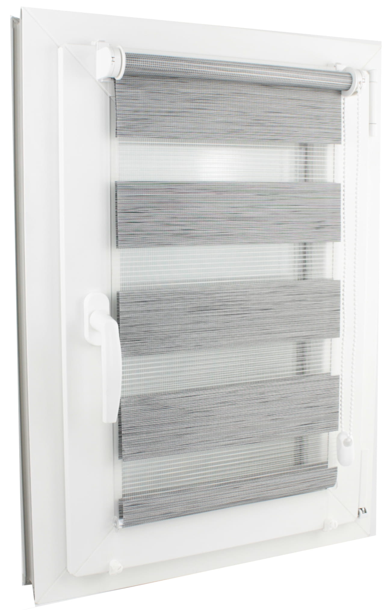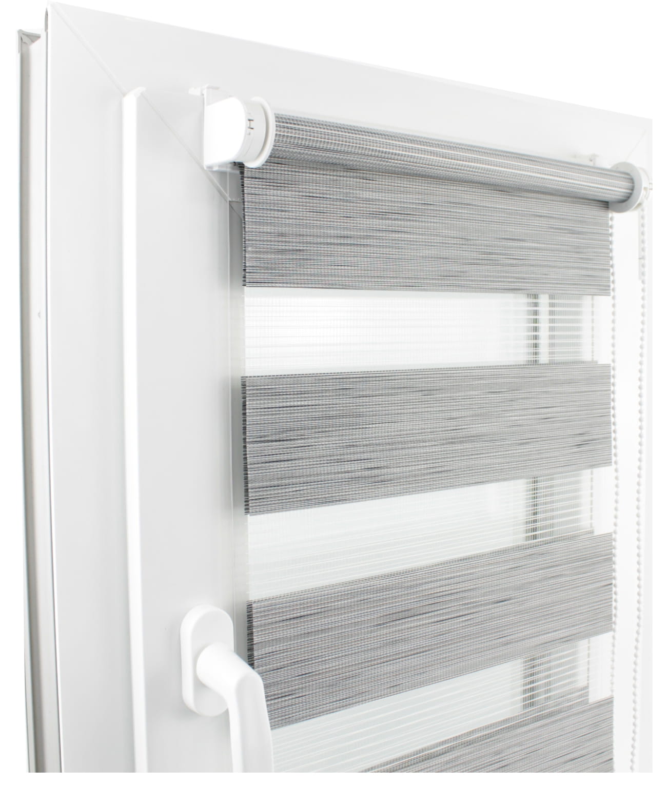 Tkanina zastosowana w rolecie dzień i noc dzięki naprzemiennym pasom umożliwia precyzyjną kontrolę światła. Ustaw ją w dowolnej pozycji, aby wyregulować ilość wpadającego światła lub zlicować zaciemniające pasy dla zachowania prywatności.