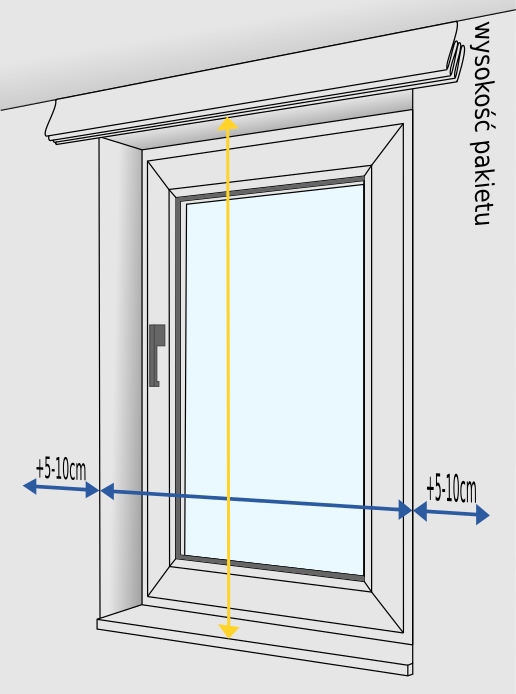 - pionowa strzałka - mierzymy wysokość wnęki plus wymiar nadproża (proszę pamiętać, że roleta rzymska nie zwija się całkowicie i potrzeba minimum 25 cm wolnego miejsca dla zwiniętej rolety).
